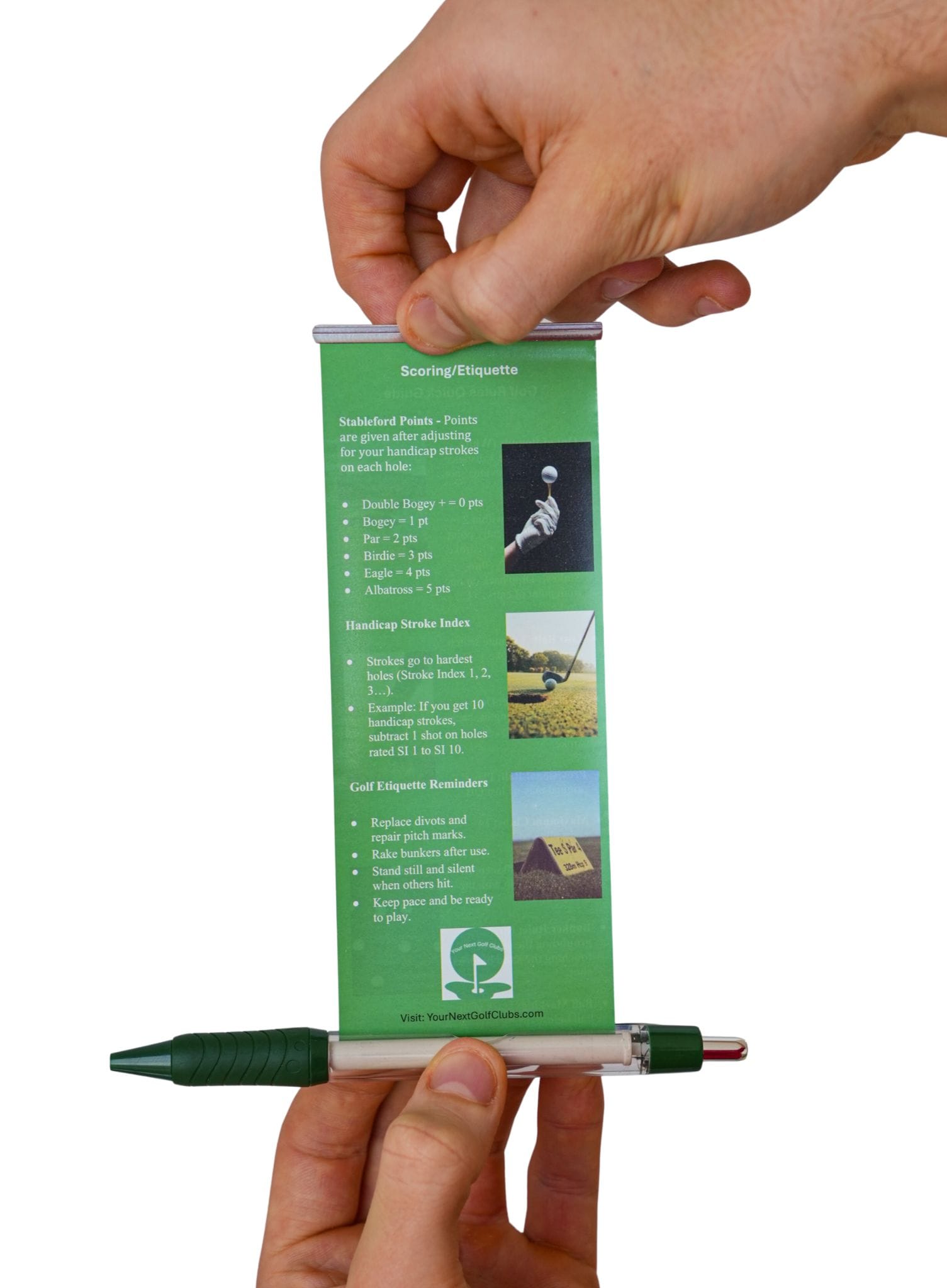 The Golf Rules Pen is the only ballpoint pen with a pull-out quick reference guide to the most common golf rules, Stableford scoring, and on-course etiquette. Whether you’re marking a scorecard or double-checking a ruling, everything you need is right in your pocket.